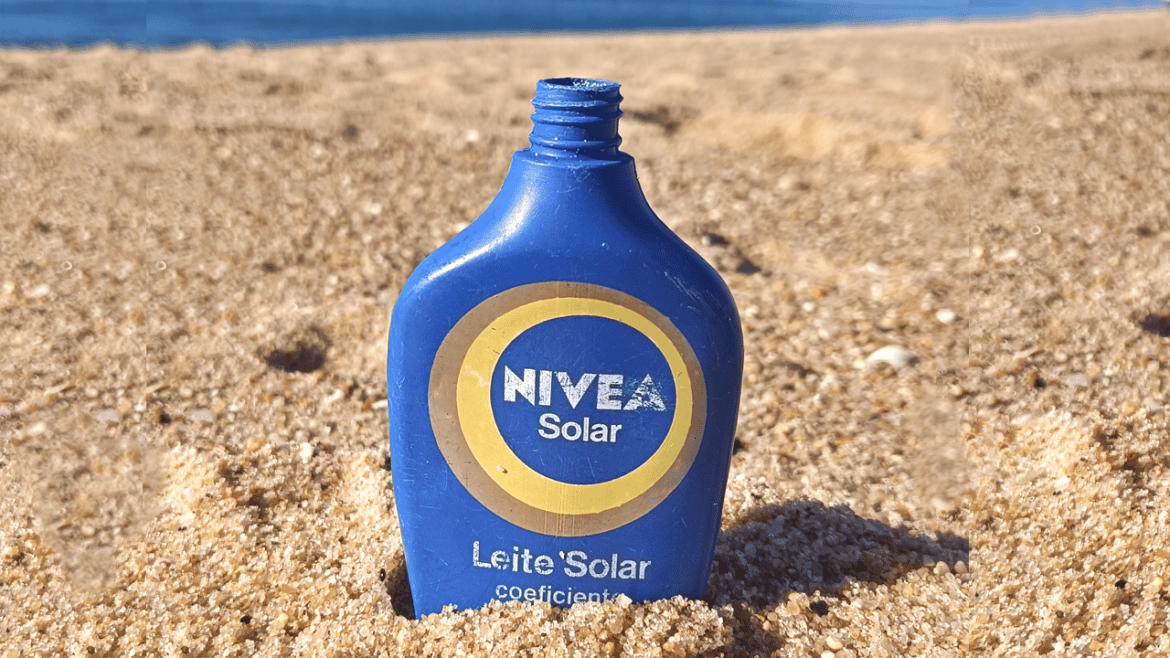 Encontramos este frasco de Nivea solar en una playa al norte de Portugal y nos llamó la atención el diseño y que tuviera solo un factor de protección solar 3.